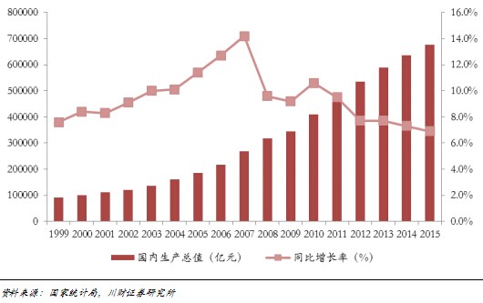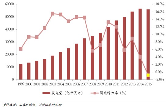 电力增长与GDP增长相关性极大,发展趋势基本吻合。改革开放以来,我国经济保持较快增长,取得巨大成就。与此同时,电力作为经济增长的重要投入品,消费增速与经济增长保持同步。按统计数据计算,1999~2015年我国经济增长了7.5倍,年均增长9.4%;全社会发电量增长了4.5倍,年均增长9.8%;相关系数约为1.04。2012年进入新常态经济以后,经济平均年增长7.4%,发电量平均增长4.5%,相关系数约为0.6。