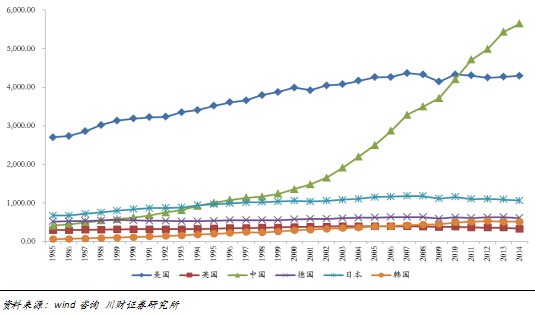 既然经济没有长盛不衰,那么电力需求的增长又是如何?我们继续以美国、德国、英国、日本、韩国为例,图8中可以看出,各国电力长期以来基本都维持在一个相对稳定的范围波动,缓慢增长,只要经济不出现大问题,电力涨幅平稳。战后美国超过二十年的经济持续高速成长,美国的电力需求成长率都是保持在每年大约7%左右的成长率。我国则是一枝独秀,短短二十年间,超过美国,发电量全球第一。