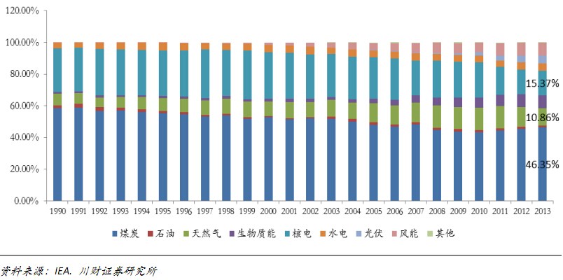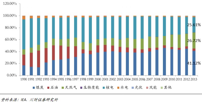 由上述国家电力结构变化看出,作为可以提供稳定输出的火电,气电,核电,三种类型发电总和超过本国发电总量的70%,其中火电相当于气电与核电的总和,但是总量仍然在70%左右,也就是说,70%的稳定电源在未来电力结构中是必须的,结构调整无非是向着安全、清洁、高效的方向发展。