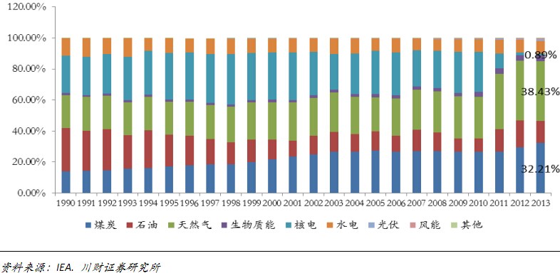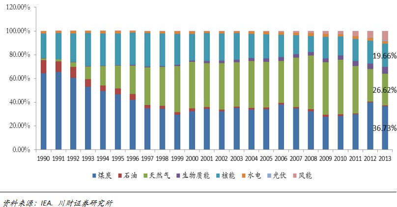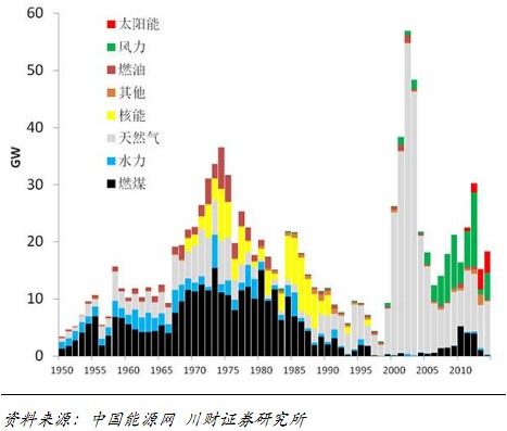 在1985年以前美国每年新增的发电机组容量中,一直都是以燃煤的火电机组站为主力。但是在1985年以后,美国燃煤发电的发展急剧减少,而天然气发电开始崛起,到了2000年之后,天然气发电在新增的发电装机容量里占据了压倒性的优势,大幅增长,到2013年占比达到26.9%。