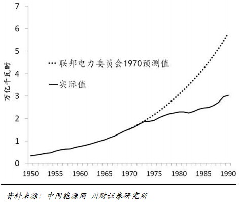 图18:美国联邦电力委员会1970年所作长期电力需求预测与实际值比较