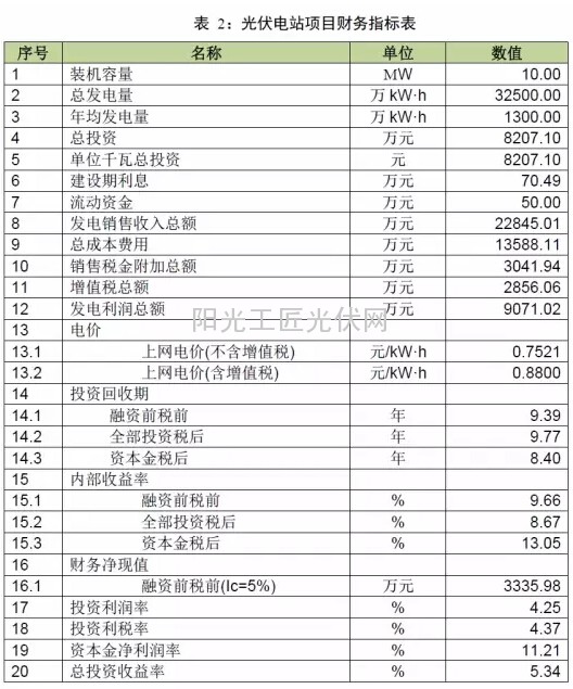 四川省属于Ⅱ类资源区,对应的光伏标杆电价为0.88元/kWh。假设项目单位造价为8000元,装机容量10MW,依据以上条件测算,在没有政府补贴的情况下,该项目融资前税前收益率在9.66%之间,投资回收期在9.39年之间,项目具有一定的盈利能力。具体见下表。