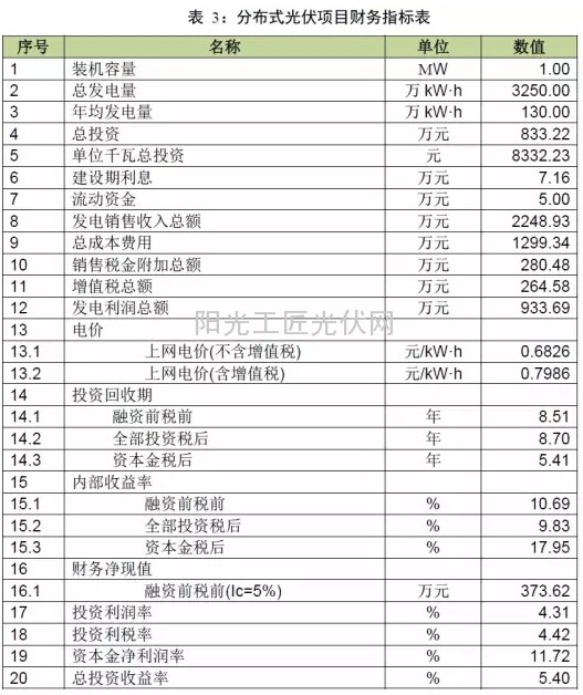 全部“自发自用”,则电价为售电价格、国家电价补贴价格之和。根据四川北省电网销售电价表,项目电价采用一般工商业电价最高,为0.7986元/kWh,项目装机容量为1MW,单位造价为8200元。依据以上条件测算,项目融资前税前收益率在10.69%之间,投资回收期在8.51年之间,项目具有一定的盈利能力。具体见下表。