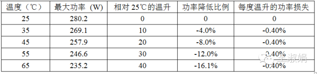 从上图可以看出,当温度变化时,最大功率按照温度系数的比例逐渐下降, 如下表所示。