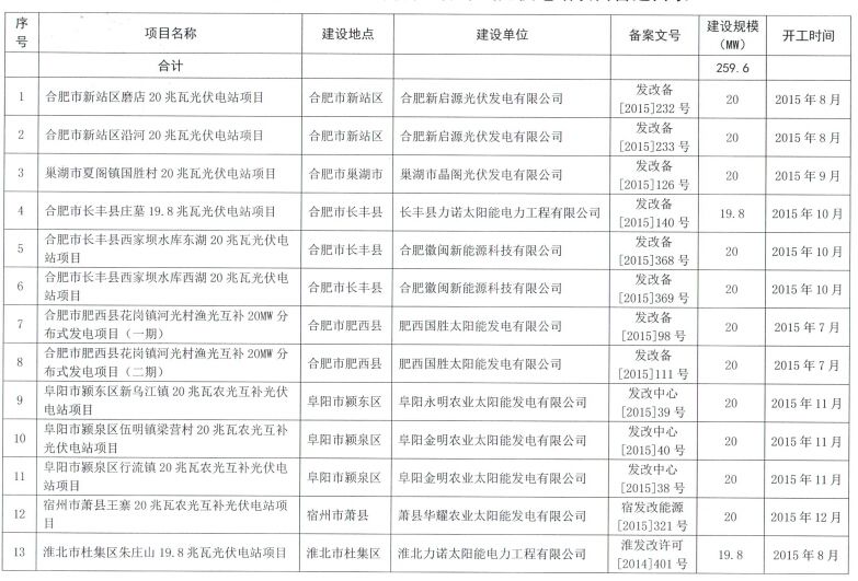 合肥等有关市发展改革委报来的合肥市新站区磨店20兆瓦光伏电站等13个项目相关手续办理齐全、主体工程建设较快,具备并网条件。按照《安徽省能源局关于进一步加强光伏电站项目开发管理的通知》(皖能源新能〔2015〕26号)精神,现将这13个项目列入我省2016年第一批“先建先得”分布式光伏电站项目备选目录,请项目单位据此向省电力公司和省物价局申请办理并网手续和电价批复。