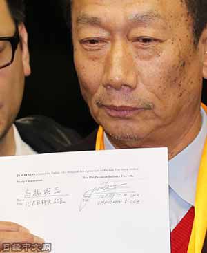会谈结束后向媒体展示继续磋商协议书的鸿海董事长郭台铭(5日,大阪市阿倍野区)