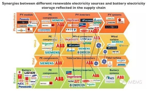 这些应用包括:光伏和电池存储、光伏和插电式混合动力汽车充电系统。创新的技术解决方案通过提高性能、降低成本、延长寿命和提高可靠性,使企业与其竞争对手形成差异化。ABB、GE和Ingeteam等企业通过发挥不同可再生能源间的协同作用,以及和电池存储系统之间的协同作用,扩大各自在新兴的相关市场份额。电池存储系统可以解决大量光伏和风能电站供电产生的间歇性问题。