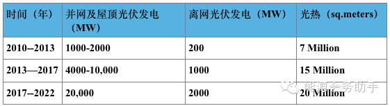 2011年印度政府批准了尼赫鲁国家太阳能任务,最终确定的主要发展目标是在2022年之前通过三个阶段性发展(如下表),将印度境内光伏发电量提升到20GW,离网光伏安装量达到2GW,共计22GW。