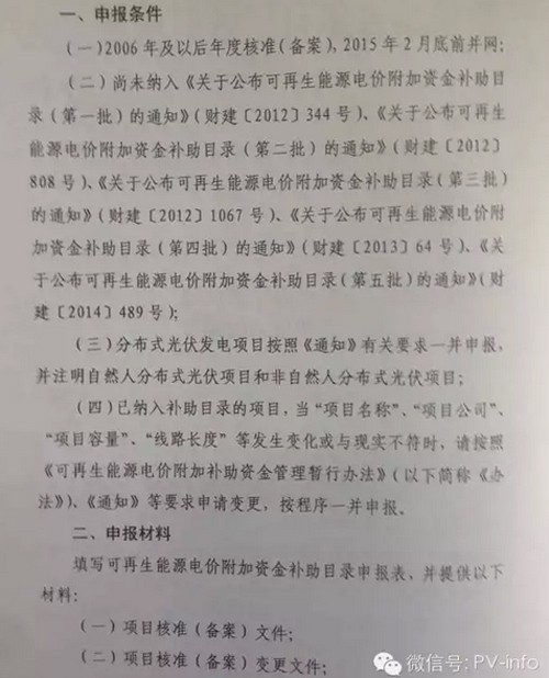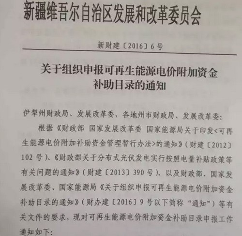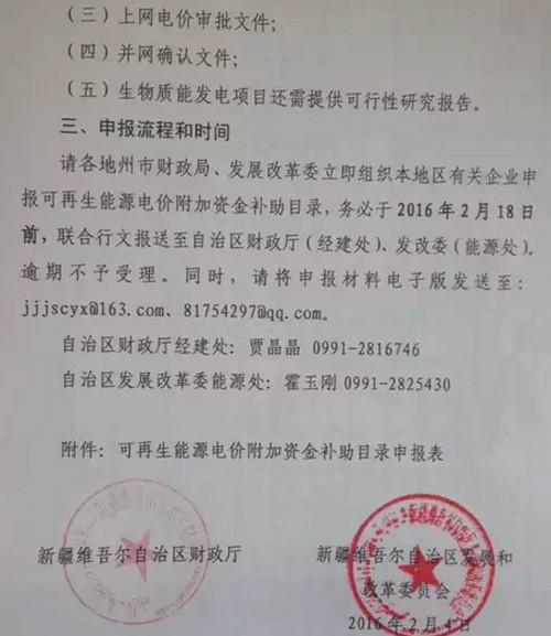 2月4日,新疆维吾尔族自治区财政厅,发改委联合下发《关于组织申报可再生能源电价附加资金补助目录的通知(新财建[2016]6号)》(以下简称通知),通知称在2006年以后年度核准(备案),2015年2月底前并网,且未纳入之前几批申报目录的项目,可参与此次申报工作;申报截止日期为2016年2月18日。