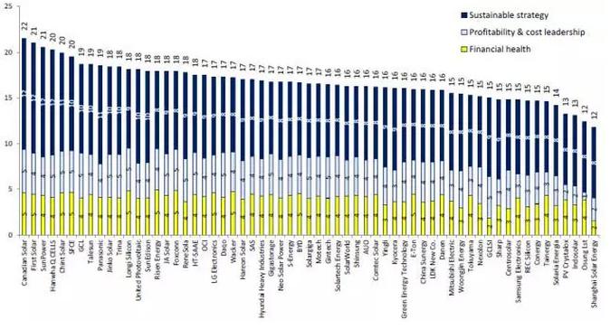 索比光伏网讯:PHOTON Consulting发布2015年第四季度全球光伏企业“铁人三项”竞争力报告《PV Triathlon》,从全球范围选取61家具有高知名度,并且在现金流、经营效率(盈利与成本控制力)、长期发展战略三个方面表现优秀的硅料、硅棒/硅片、电池、组件企业进行排名比较,对光伏企业综合竞争力作出全面分析。