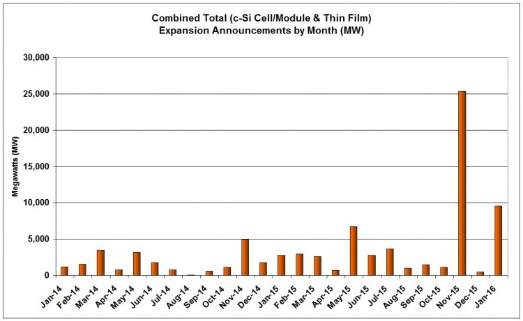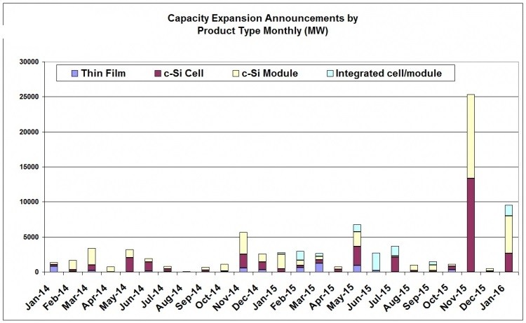 据外媒发布的2016年1月光伏制造业产能扩张公告初步分析透露,计划未产能扩张将超过9.5GW。