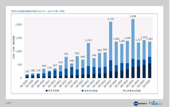 美国太阳能市场保持着破纪录的发展势头,在2015年第三季度中新增装机容量为1361兆瓦,在2015年太阳能市场前三个季度中提升了4.1吉瓦。得益于住宅太阳能市场的快速发展,2015年第三季度成为美国太阳能装机容量连续增长的第八个季度,太阳能装机容量增加超过1吉瓦。