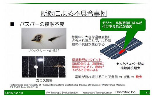 这种太阳能电池板设置并开始发电后,因为设置环境中的温度随着时间的推移会大幅变化,焊锡的接触不良会越来越严重,从而导致单元与母线之间的接触电阻升高,即使能够发电,通过这里的很多电流也会转化成热量而流失。