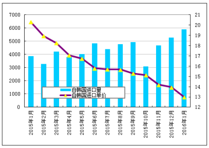 2016年1月份从韩国进口多晶硅量为5897吨,环比增加11.5%;进口单价再创历史新低至12.99美元/千克,环比跌幅为6.9%。