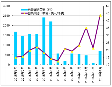 2016年1月份从美国进口多晶硅量为690吨,环比增幅为611%;1月份进口单价小幅大幅上涨至43.67美元/千克,环比增幅为105%。