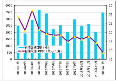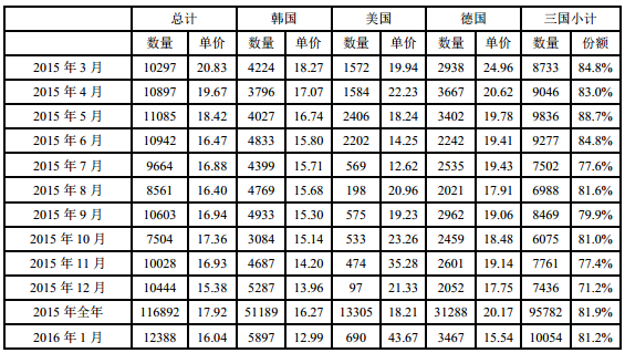 附表:2015年-2016年我国多晶硅进口情况(单位:吨、美元/千克)
