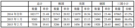 2016年1月份从德国进口多晶硅量为3467吨,环比增加69.0%;1月份进口单价创历史新低至15.54美元/千克,环比跌幅为12.5%。