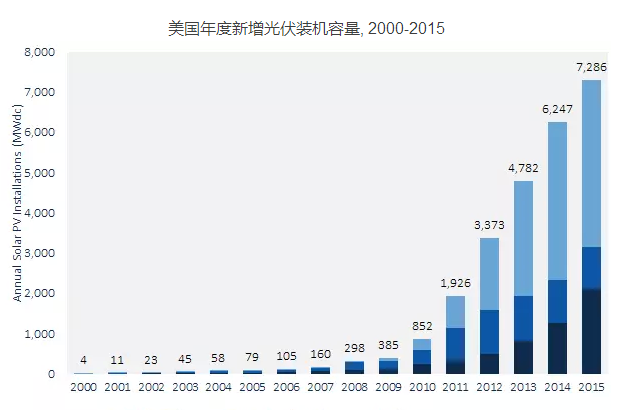 2015年美国光伏新增装机量达到创纪录的7.286GW,同比增长17%。