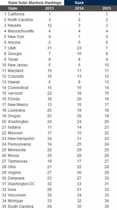 在加州、北加州、内华达州、马萨诸塞州以及纽约州等地区的拉动下,美国光伏市场年增长率超过17%。从地域分布来看,2015年市场以13个装机量超过100MW的州为中心继续扩张。部分州的光伏事业突飞猛进,其中犹他州排名从23位蹿升至第7位,佐治亚州从第16位上升至第8位。