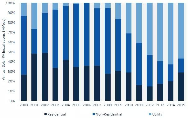2015年美国户用光伏市场增长了66%,年增量首次超过了2GW大关。户用光伏占美国市场总量的29%,占比达到2009年以来的新高。