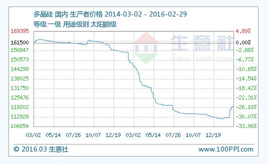 产品:2月份国内多晶硅厂家开工率整体维持在七成左右,库存充足,下游光伏产业快速发展,带动上游多晶硅原料市场行情向好发展,多晶硅市场价格出现大幅上涨,市场成交量也较前期有所增加。目前重庆大全新能源太阳能级多晶硅装置年产能8000吨,目前装置正常开车,出厂报价在120000元/吨,出货正常。
