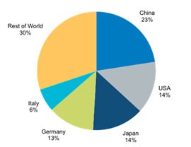 而中国、美国、日本、德国和意大利占据总量的70%。德国每年装机量停滞不前,从第二名跌到了第四名,被美国和日本超越。