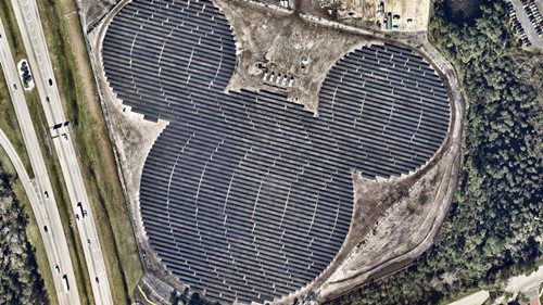 索比光伏网讯:据外媒报道,近日,在美国佛罗里达州,地表上出现了一个世界上最大的米老鼠图案。这个巨大的米老鼠头形,从空中鸟瞰十分庞大。但随后有消息称,它其实是个太阳能发电站。由于就建造在迪士尼乐园旁边,电站就用太阳能发电板拼出了米老鼠的头型,兼具发电与宣传的效果。