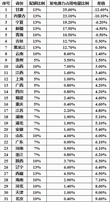 然而,哪些省份是买方?哪些省份是卖方?下表为“国家给各省的可再生能源配额”、“在不限电的情况下,各省风电、光伏可能的发电量占用电量的比例”以及两者之间的差额。