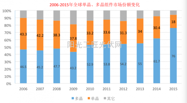 2006~2015年单晶、多晶产品在光伏市场份额的变化