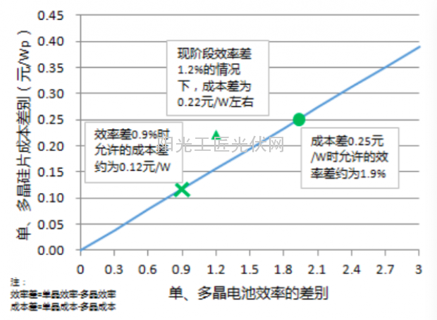 具体到光伏电站,在同样的建设成本约束下,就单晶、多晶电池转换效率差与允许的硅片成本差作了个简化的关系图(图5)。目前常规电池线生产的P型多晶、单晶电池转换效率的差别在1.2%左右(多晶18.3%和单晶19.5%),这种情况下,多晶、单晶硅片成本差小于0.16元/Wp时,电站终端选择单晶产品才会有系统成本优势。