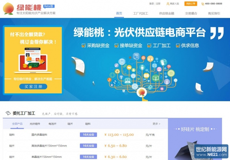 在绿能桃电商平台上,光伏产业上下游的各个参与方都能找到自己的入口。光伏产品加工厂、光伏产品的采购方都可以在绿能桃完成网上交易,并通过供应链金融解决交易过程中的资金缺口,实现从撮合交易、物流服务到金融服务的整体解决方案。