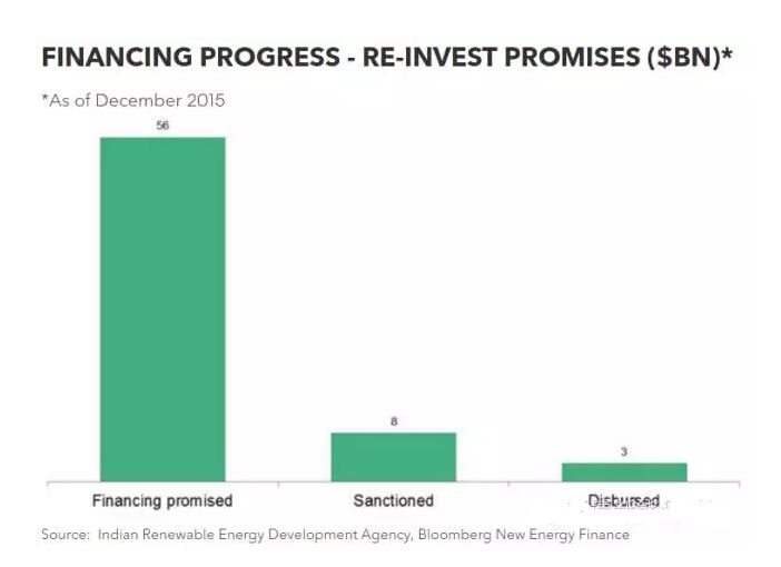 索比光伏网讯:在一年前举行的可再生能源投资大会(RE-InvestConference)上,银行和金融机构曾承诺将支持印度可再生能源项目,使其产量达到80GW。彭博新能源财经分析了他们的进展及其对于低关税(太阳能)、产出浪费(风能)以及出人意料的能源需求疲弱的担忧。