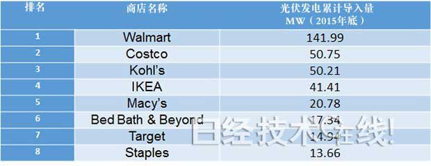 沃尔玛不仅是美国最大的零售店,而且据说非住宅用光伏发电导入量也是美国最大。该公司从2005年就开始为店铺导入光伏发电系统了。目前沃尔玛已在348个场所(店铺和物流中心)导入了142MW光伏发电系统。每套系统可为每个店铺或物流中心提供的电力占其耗电量的15~30%。该公司提出了2020年将美国店铺的光伏发电导入量扩大至两倍的目标。