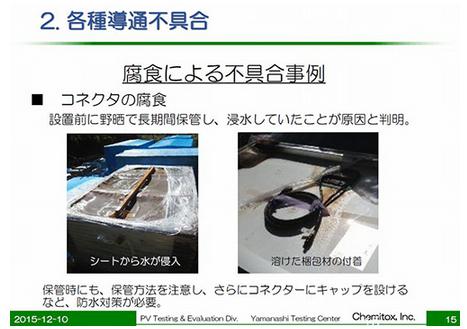 要防止这类故障,就要注意收货后的太阳能电池板保管方法。在连接器上设置防水盖等对策应该也会有效。