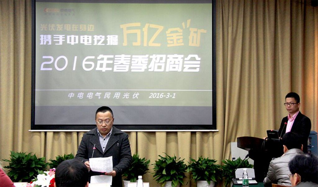 会议开始前中电电气民用光伏总经理王强在会上致辞中表示,在国家政策大力扶持和推动下,中国的光伏产业已成为一项能够左右国际市场的产业,中电电气民用光伏也积极响应国家“光伏扶贫,精准扶贫”号召,将发展光伏事业为己任,目前民用光伏在全国已设立了近300家经销服务网点,为千户家庭输送了绿色能源!王总表示,国内分布式光伏市场巨大!光靠企业本身是远远不够的,希望能够携手在座各位共同发展光伏事业,挖掘市场万亿金矿!也为在座各位不远万里来到招商会深表感谢!