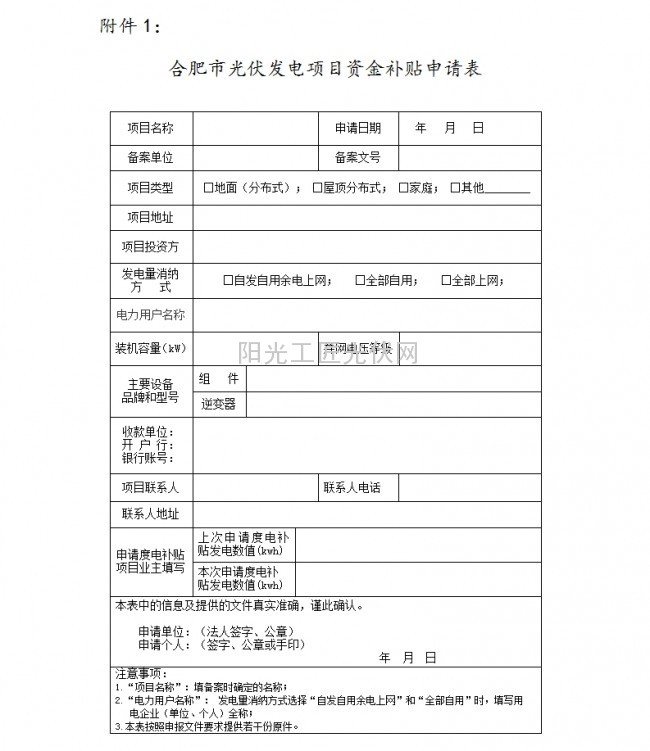 (1)《合肥市光伏发电项目资金补贴申请表》原件(附件1);