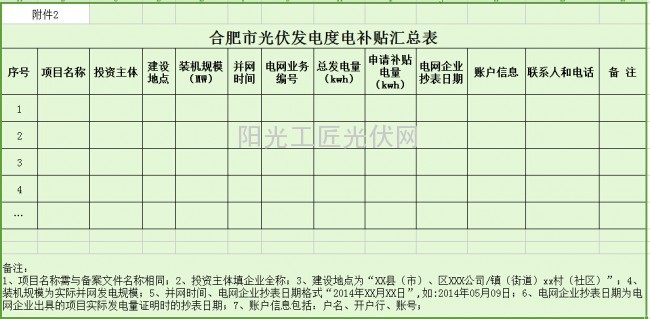 (7)《合肥市光伏发电度电补贴汇总表》(附件2)(企业盖章)。