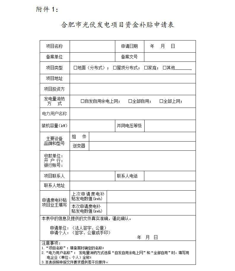 附件:1.合肥市光伏发电项目资金补贴申请表
