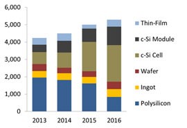 亚洲主要制造商包括阿特斯、韩华Q CELLS、晶澳太阳能、晶科能源和天合光能。这些公司的资本支出主要也是受到年组件出货量目标的驱动。阿特斯、晶科能源和天合光能成为今年最大的组件供应商,预计2016年出货量将达到6GW。