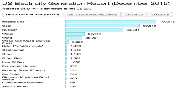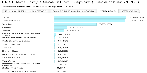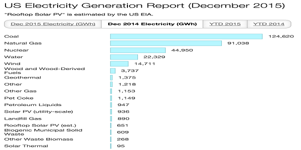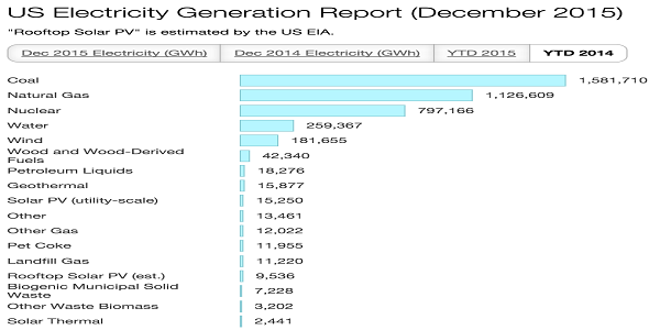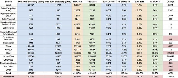 索比光伏网讯:2015年美国风能及太阳能发电同比增长20659兆瓦时。相比之下,矿物燃料发电下降18041兆瓦时。此外不幸的是,某种程度上由于严重干旱,水力发电减少8199兆瓦时。