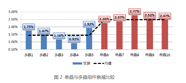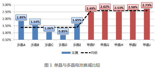 从图1和图2显示,同样辐照量下,无论电池端,还是组件端,单晶较多晶衰减均高1.00%,即单晶比多晶光衰率更高。