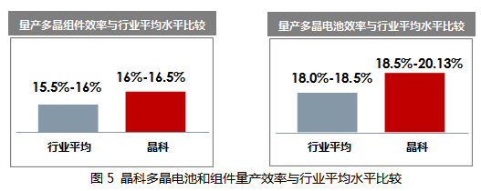 图5和图6显示的是晶科多晶电池和组件量产效率与行业平均水平及其他一线主流品牌的比较,晶科在多晶电池和组件量产功率方面遥遥领先行业和其他一线品牌。