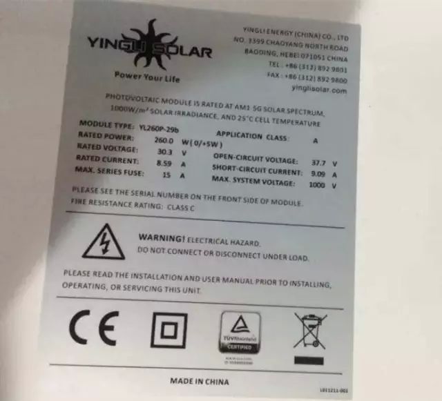大家都知道,组件产品是不断更新换代的,两三年前的产品跟现在的产品是根本不能比的,所以就有人懂歪脑筋了,我低价收购一线厂商过去的产品,再换个标牌,冒充现在的产品,不就赚大钱了嘛?前两天,伏妹就遇到了这样一个案例。看条形码,是英利的没错,系统里也查得到,但一看后面的标牌,问题就来了,系统里显示的是一个240瓦的组件,怎么标牌上是255瓦呢?标牌上的logo字体看着也不太对啊。
