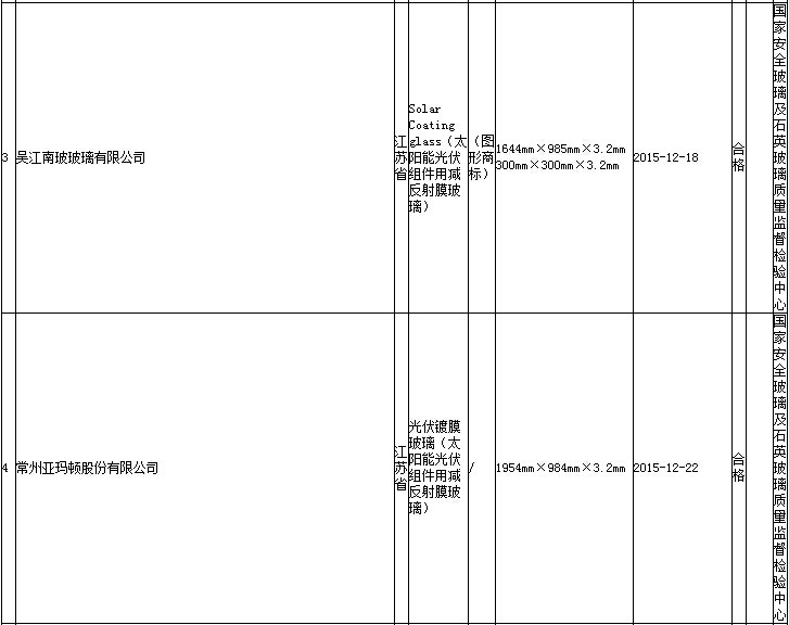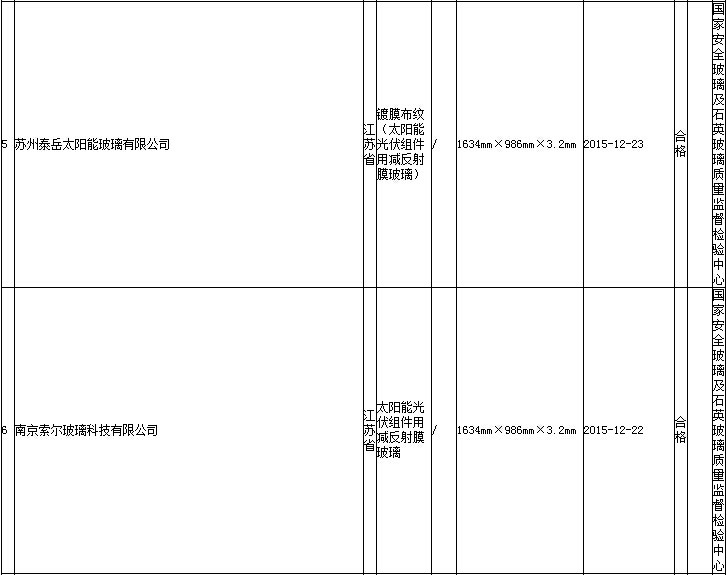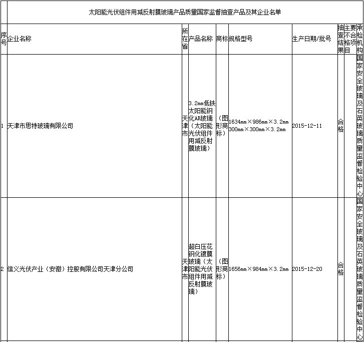 据通报,2016年第1批,共抽查了天津、江苏、浙江、安徽、福建、河南、广东、陕西等8个省、直辖市30家企业生产的30批次太阳能光伏组件用减反射膜玻璃产品。依据JC/T2170-2013《太阳能光伏组件用减反射膜玻璃》等标准的要求,对太阳能光伏组件用减反射膜玻璃产品的碎片状态、霰弹袋冲击性能、光学性能(太阳光有效透射比)、耐洗刷性能、耐中性盐雾性能、耐湿冻性能、耐紫外性能等7个项目进行了检验。