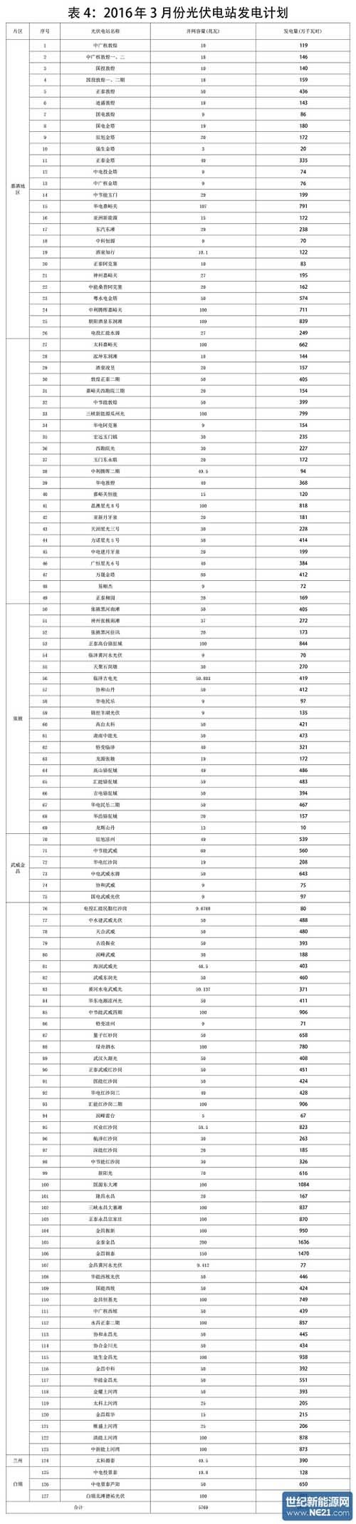 预计3月份光照强度较上月增强,考虑电力电量平衡和电网安全保障性约束因素,预计2016 年3月份可完成光伏发电量5.02亿千瓦时,见表。