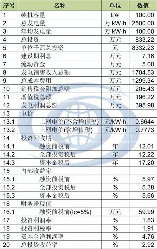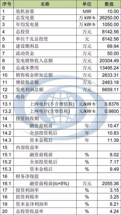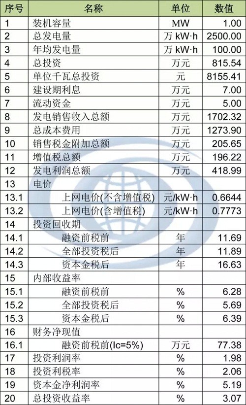 假设项目装机容量为10kW,单位造价为8200元,年满发小时数1000小时,电价不变。依据以上条件测算,该项目融资前税前收益率在5.97%之间,当单位造价7100元时,项目融资前税前收益率在8.03%左右,具体见下表。