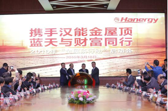 索比光伏网讯:2016年3月18日,中国北京奥林匹克森林公园汉能总部——全球领先的太阳能薄膜发电企业汉能举行了“金屋顶行动”启动大会,隆重宣布向全社会特别是工商业主征集优质屋顶资源,一旦符合汉能标准将被纳入“金屋顶”计划。“金屋顶”业主将在汉能的全方位助力下顺利开启“金”色财富并对节能减排作出重要贡献。