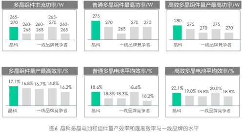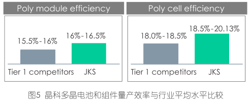 图5和图6显示的是晶科多晶电池和组件量产效率与行业平均水平及其他一线主流品牌的比较,晶科在多晶电池和组件量产功率方面遥遥领先行业和其他一线品牌。