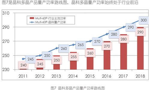 晶科将利用光学二次利用技术,电路优化增效技, 组件新结构技术,2年内实现60P多晶组件300W量产,5年内实现60P多晶组件330W量产。