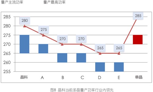 晶科多晶量产主流功率(265-275W) 及量产最高功率(280W)较行业多晶平均水平高1-2个档位(行业多晶量产主流功率255-265W, 多晶量产最高功率270-275W),而较行业单晶量产功率仅低1个档位。晶科多晶产品功率当前在行业内处于领先水平。